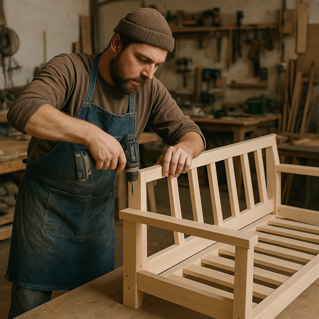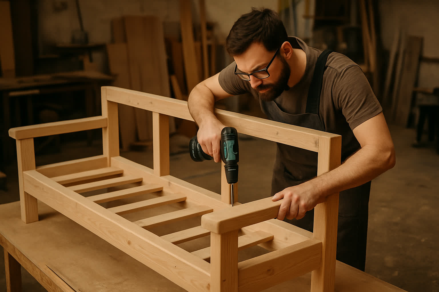 - Збирання меблів та дерев'яних елементів, включаючи столи, дивани, пуфи та крісла.